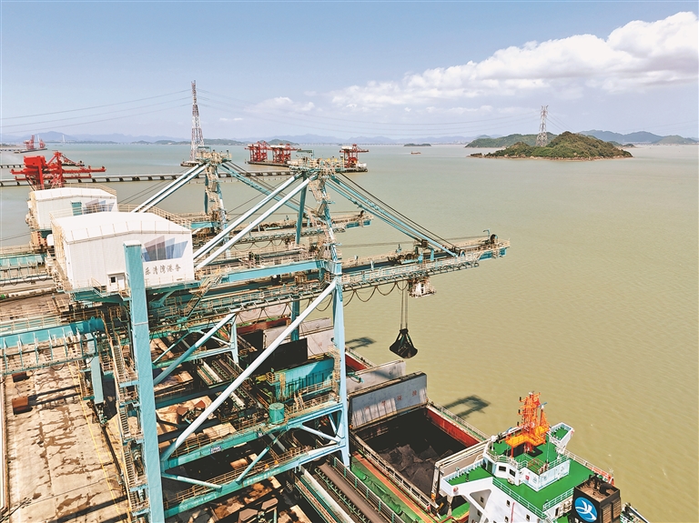 5月17日,在浙江省温州市乐清湾港区大宗散货码头,货轮停靠在泊位上装卸煤炭。新华社发