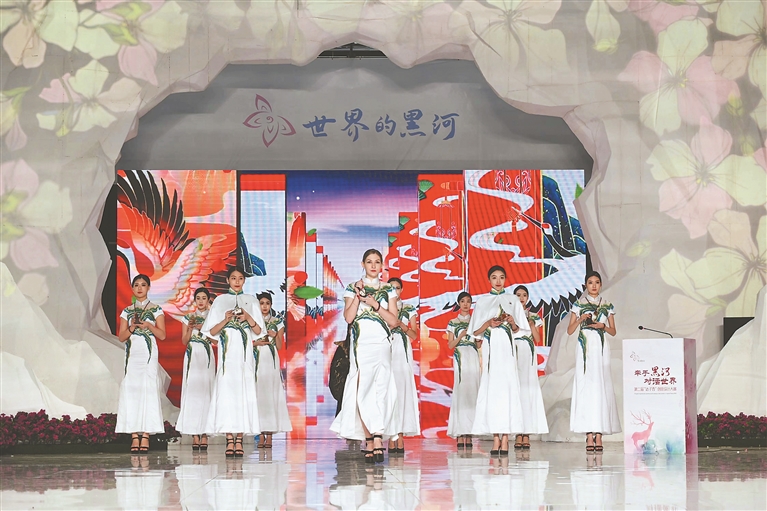 在黑河市创意设计大赛颁奖典礼上,模特展示逊克玛瑙作品。