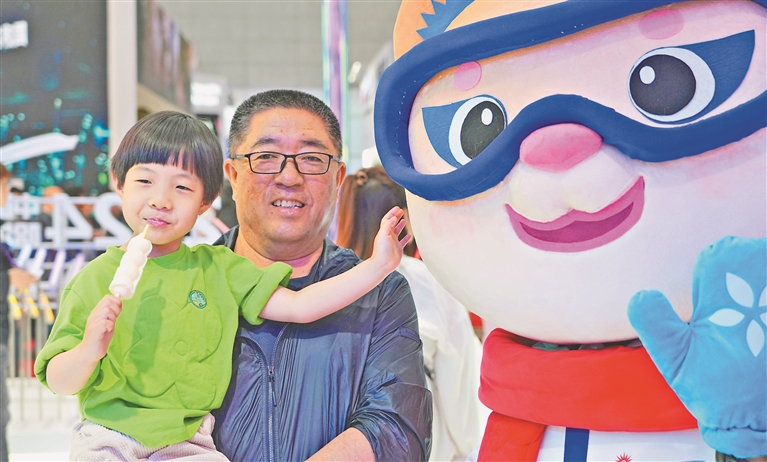 “火出圈”的“婴儿肥”大雪人被做成壁雕,供现场观众“打卡”;萌萌的‘滨滨’‘妮妮’吉祥物玩偶,圈粉无数;左手吃着新疆牦牛肉干,右手喝着甘肃油茶……
