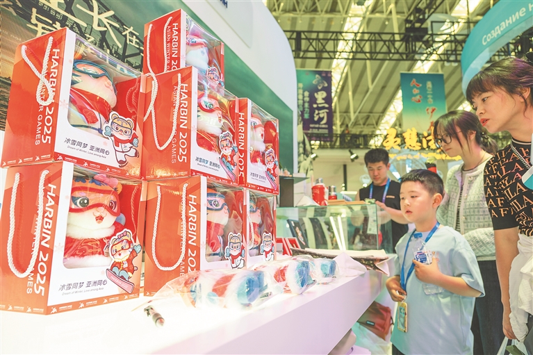 哈尔滨展区文创设计区域门庭若市,展台上摆满了亚冬会吉祥物“滨滨”“妮妮”和会徽“超越”元素的纪念章、钥匙链、毛绒玩具、胸针等商品。其中,“滨滨”和“妮妮”系列的玩偶、钥匙链、胸针最为俏销抢手。这是小朋友在挑选亚冬会纪念品。本报记者 张春雷摄