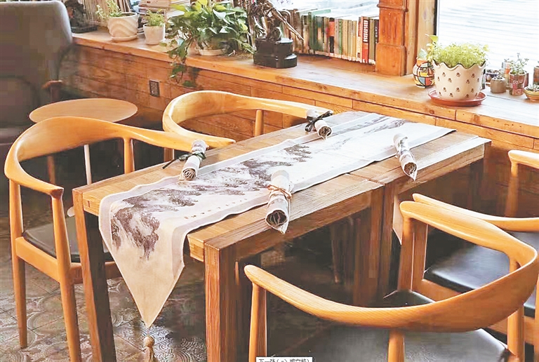 在桌旗旁,一张名为“紫烟升处百花开”的茶垫也吸引了往来人群。武嘉怡说:“这是我们与省级非遗传承人刘喜林老师联合出品的亚麻茶垫,茶垫中央是四角呈石榴状的柿蒂纹,寓意世代兴旺,茶垫左半部分饰两朵缠枝牡丹、两朵缠枝芙蓉,右半部分饰四朵缠枝菊花,寓意四季平安。整个画面百花齐开,洋溢着勃勃生机,且画面布局不是常见的对称美,而是一种参差错落之美,更给人一种目不暇接、触目生春之感。”