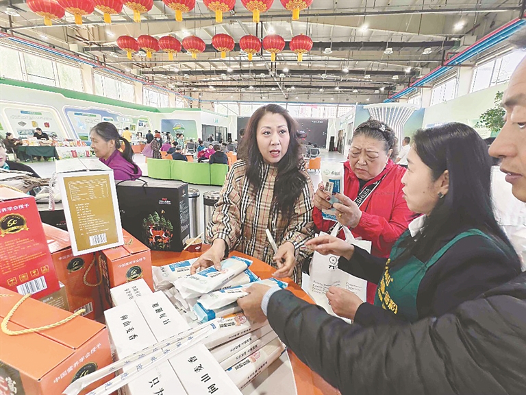“请大家按顺序付款,别挤,我听不清楚收款提示音了。”北大荒集团展区的勃利蓝靛果产品吸引了多人驻足品尝购买,展销人员忙得不可开交。