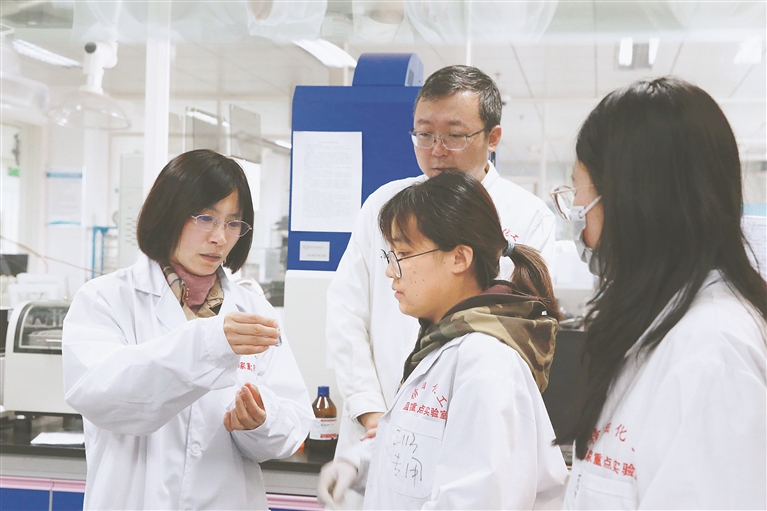 大连理工大学化工学院樊江莉(左)教授与同事及学生查看实验结果(2021年11月摄)。 新华社发
