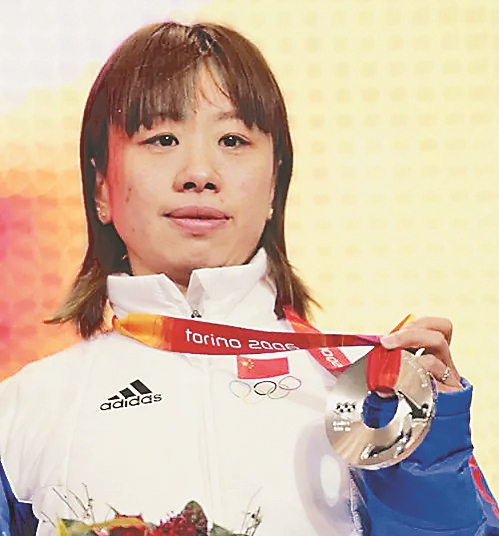 2006年都灵冬奥会速滑女子500米颁奖仪式上,获得银牌的王曼丽。