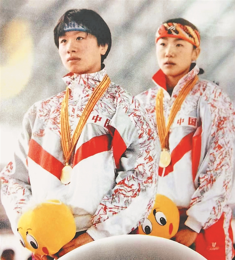 1996年第三届亚冬会,并列获得速滑女子500米金牌的王曼丽(左)和薛瑞红在颁奖仪式上。