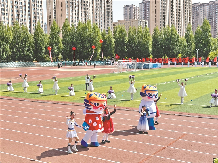 伴随着激昂的《运动员进行曲》,包括国旗护卫队、花束队、各学校方阵在内的28支检阅队伍迈着矫健的步伐依次走过主席台,接受大会检阅。伴着“请党放心 强国有我”的激昂誓言,来自道外区的育英小学、南岗区的继红小学、松北区的师范附小、香坊区的实验农场子弟学校的学生依次带来多姿多彩的团体操表演。