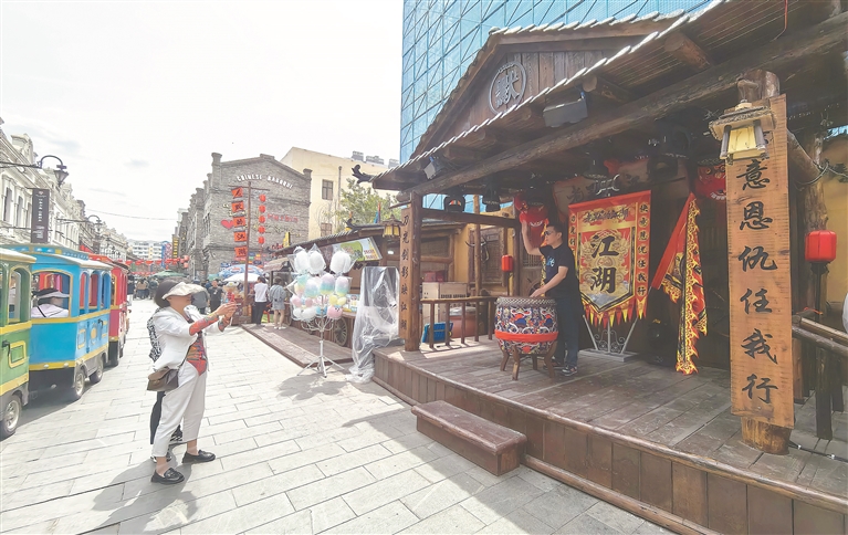 伴随着欢快喜庆的节奏,一场精彩的秧歌演出在南三道街老道外大戏台前上演,引来不少市民和游客驻足欣赏。据了解,道外区委宣传部、区文旅局等部门在街区经常开展群众性文化活动,使街区客流量稳步增长。