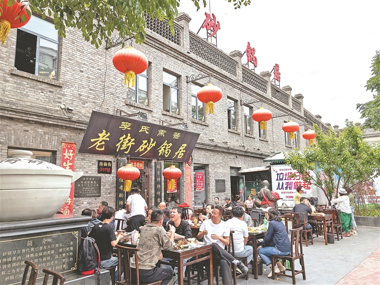 十足的武侠风,街区南二道街“老默的江湖音乐酒馆”格外吸睛,让人们体验现实版的武侠情节。“这家酒馆很有特色,酒是用碗喝的,‘大碗喝酒、大口吃肉’的体验感很强,而且还能欣赏演出。这种娱乐方式很特别,令我很放松。”游客许先生兴致勃勃。