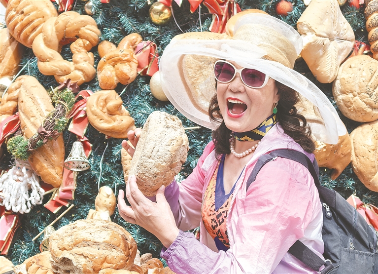南三道街的奥西娅列巴店门前的面包树引来不少市民和游客围观。面包树旁的桌子上,摆放着两个逼真的面包模型。“端”起大面包,“咬”上一口,拍个美照,许多市民和游客正排队等待记录下这美好的瞬间。