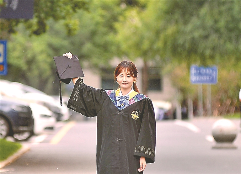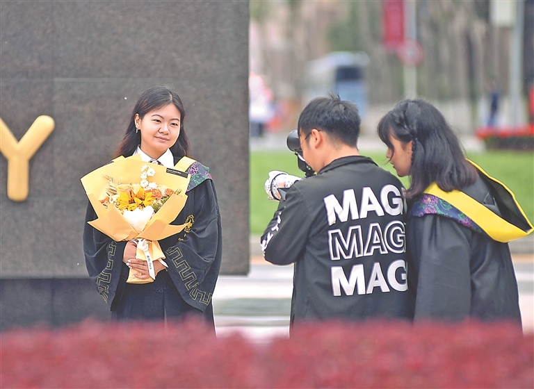 2日,哈尔滨工业大学校园内,即将毕业的大学生们穿上博士服、硕士服、学士服在学校拍照留念。