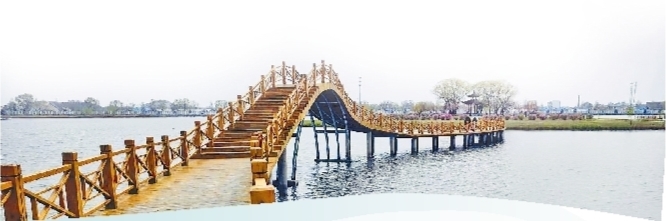 卧龙湖中有一个九道弯的木制栈道,被称为九曲栈道。栈道与湖心岛相连,远眺就像一条卧龙在湖中腾飞。走进湖心岛,让人目不暇接,岛的中间最高处有一个六角凉亭,凉亭造型别致,优雅美观。凉亭周围有几十棵高大的榆树,树上有两个喜鹊巢,几只喜鹊站在巢边不停地叫着,不知道它们是欢迎我们还是在撵我们。有一同学盯着花喜鹊自言自语地说:“花喜鹊你们生活在树上,我们生活在地上,地球可是咱们共同的家园啊!”