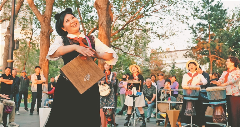 在此游玩的游客被悠扬的乐曲和激情的表演所吸引,大家驻足围观,不时和着音乐的节拍与乐队共舞,氛围热烈。