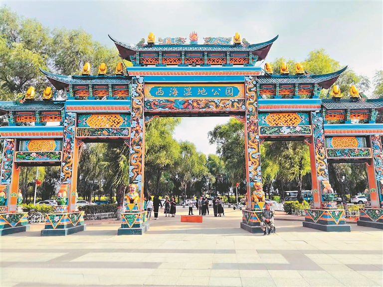 举起望远镜,还会清晰地看到,几只或十几只一米长的白色身躯,两米多长的双翅,长长的嘴,白白的羽毛,黑黑的羽翼一会翩翩飞翔,一会嘎嘎叫上几声,单脚站立扇动宽大的翅膀,用头梳理着自己的羽毛,这是国家一级保护动物东方白鹳。有时还可以看到长腿、长颈、红色嘴巴、体态修长,头上点缀着红点的丹顶鹤。它们有时胸脯挺得直直的,昂首前行似威武的壮士,有时曲颈低头胜似淑雅的仙子,叫声响亮而沉静,胜似一曲曲动听音乐。在这里常见的珍稀大型鸟类还有展翅苍穹的雄鹰、飞得高高的秃鹫。进入七月,西海湿地公园伴随湖面莲花盛开,一幅世外桃源般的画卷便铺展而来。千亩莲花池里,宽阔的水面上漂浮着大片大片莲叶,托举着大朵大朵粉红色的莲花,娇艳欲滴,朵朵相依,清秀、雅洁,让人感受到了“接天莲叶无穷碧,映日荷花别样红”的美景,犹如一幅油画,为夏日增添了清幽香气和美妙的色彩。花和鸟相得益彰,游人如织,赏花观鸟和这里的美景同框,游客纷纷拿出手机拍照、录视频,留下精彩的瞬间。据悉,这里年接待游客五十多万人次。