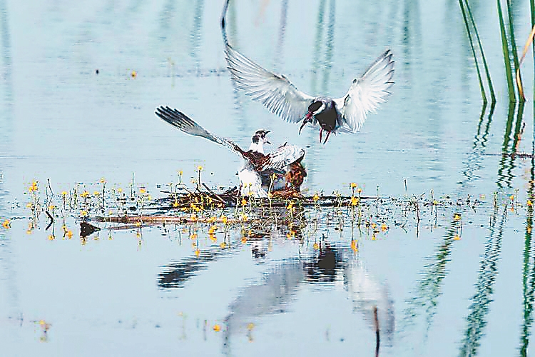 进入夏季,湿地云天寥廓,生态环境宜人。鸟儿们完成了孵化繁殖,在长达200米的九曲木栈桥两侧,鹌鹑、水雉、浮鸥、水老鸹或三五成群,或两两成对,各有一处寻食嬉戏的区域,不同鸟群之间彼此保持一定距离,互不干扰。水中一对对水老鸹带着四五只小宝宝组成的“家庭”单独栖息,“爸爸”和“妈妈”在前面引领,宝宝们在后面紧紧相随,一会儿两个“家长”钻入水中叼出一条小鱼转向身后,引来众宝宝们争抢,很快一条条小鱼喂进宝宝的嘴里,那场面令人感到十分温馨。这些鸟儿们悠哉、游哉、乐哉,丝毫不为外界的动静所惊扰。