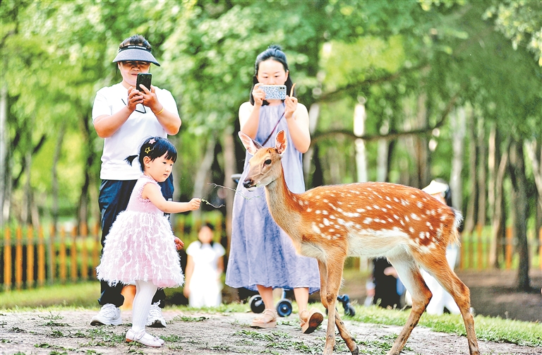 16日,阳光明媚,空气清新,哈尔滨市迎来了好天气。太阳岛上,草木茂盛,百花争艳,许多本地市民和南方游客组团来到这里避暑游玩。有的游人搭起帐篷野餐,有的游人走上湿地栈道观赏美丽风景。孩子们玩过各种游乐项目后,再与小鹿、松鼠等小动物来个亲密接触。