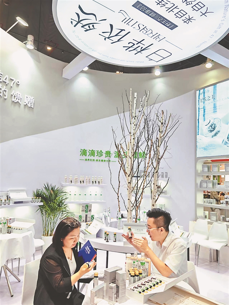 “产品所用的白桦汁原料源自铁力市,这里处在北纬47°小兴安岭的黑土地上。”黑龙江雨晓科技有限公司总经理马光西介绍,公司充分利用龙江“九珍十八品”资源,由雨晓集团与清华大学深圳科研团队合作,运用先进技术开发提炼出白桦汁精华,为消费者不断提供囗感独特的绿色饮品、化妆品。现在企业库存清空,铁力工厂正加班加点生产。本次展会的火爆出圈,让企业对白桦汁系列产品走向世界市场更加充满信心。