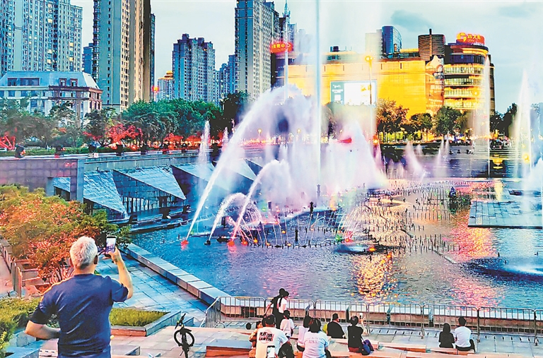 一边观赏着美丽的喷泉景观,一边享受着夏日清凉,市民、游客纷纷围坐在四周,用手机记录下精彩瞬间。