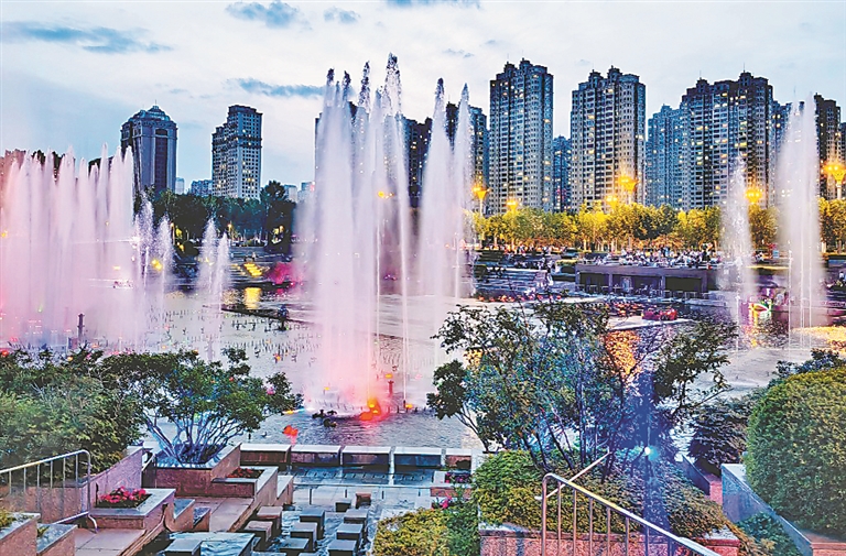 夏日夜晚,哈尔滨市群力金河公园音乐谷内,伴随着悠扬的乐曲,大型喷泉“翩翩起舞”,与霓虹彩灯交相辉映,构成一幅美丽的画面。