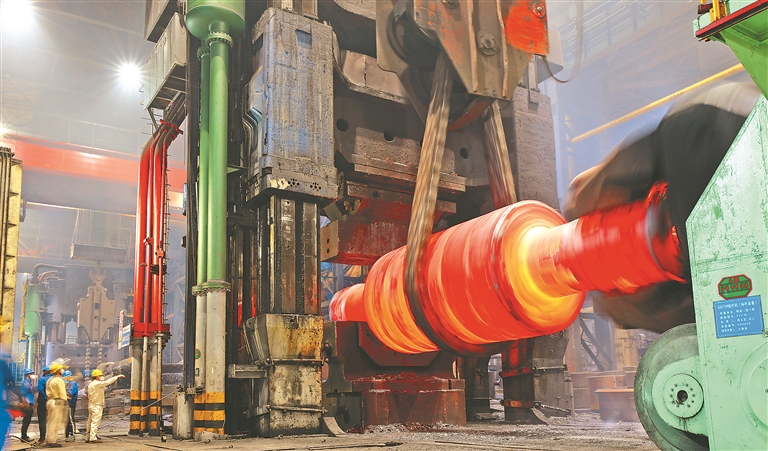 中国一重锻造厂15000吨自由锻造水压机完成百万千瓦整锻低压转子末火次锻造。