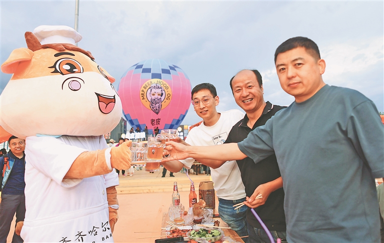 食客和吉祥物碰杯。本报记者 韩东贤摄