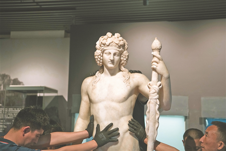 7月2日,工作人员将开箱后的古希腊文物放置在展台上。