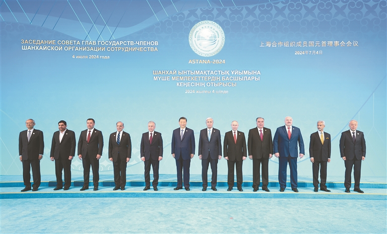 当地时间7月4日上午,国家主席习近平在阿斯塔纳独立宫出席上海合作组织成员国元首理事会第二十四次会议。这是习近平同上海合作组织成员国领导人集体合影。新华社记者 鞠鹏摄
