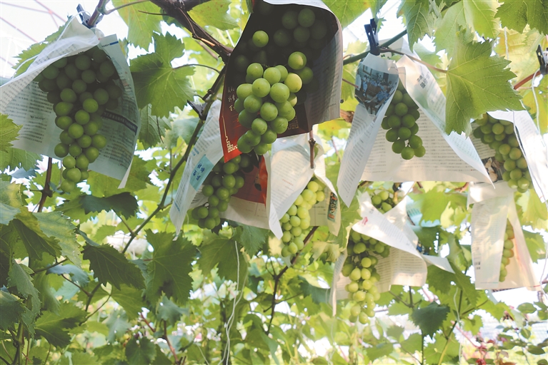 “‘阳光玫瑰’是近几年引进的新品种,因其果肉多、甜度高、口感佳,受到不少市民的喜欢,每年都有不少商家、居民前来采购。目前,‘夏黑’已处于成熟期,‘阳光玫瑰’预计9月中下旬成熟。”曹伟胜介绍。