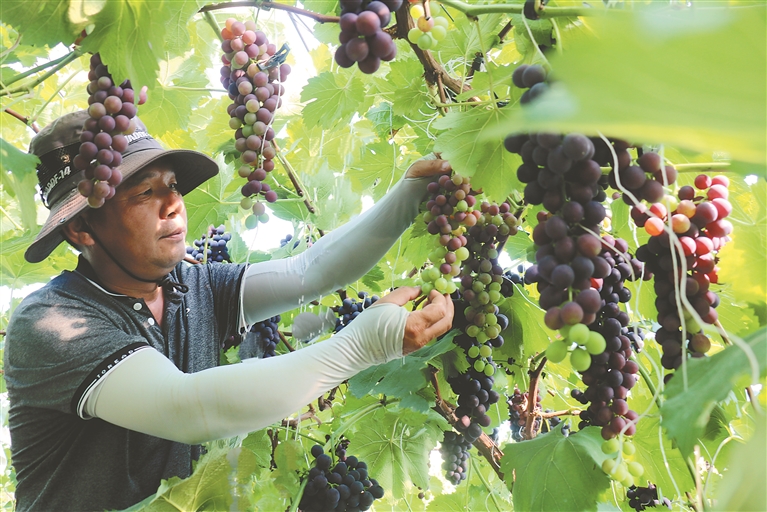 “我种的这个葡萄品种叫夏黑,外形像乒乓球,口感清脆,较甜,施用农家肥做底料,成熟早又耐运输,收购商特别喜欢。一亩地产葡萄2000斤以上,除去成本,一个大棚纯收入3万元以上,收入十分可观。”种植户曹伟胜欣喜地说。