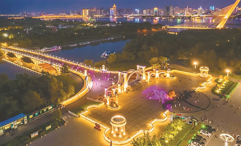 夜幕降临,灯光点亮,哈尔滨市太阳岛风景