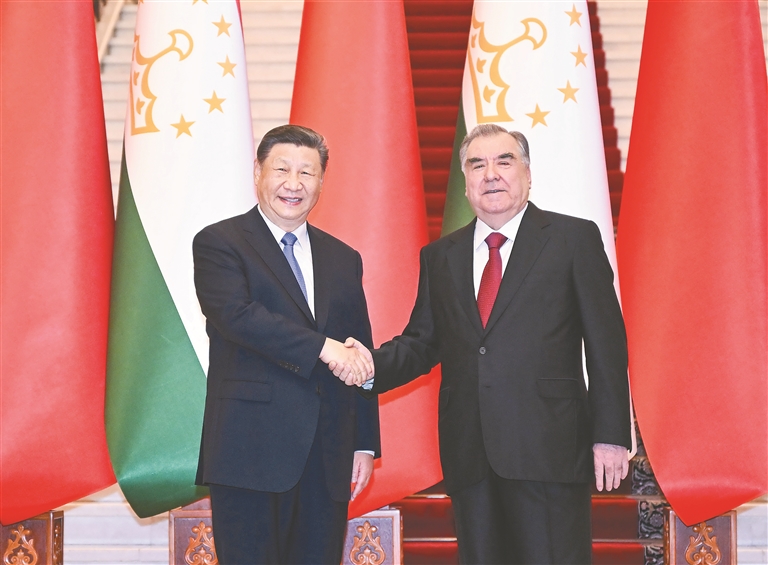 习近平指出,中国和塔吉克斯坦山水相连、唇齿相依、命运与共。两国关系具有深厚的历史渊源、坚实的政治基础、丰富的合作内涵、广泛的民意支持。在双方共同努力下,两国政治互信持续深化,共建“一带一路”合作成果丰硕,一系列重大项目进展顺利,有力促进了两国共同发展。去年,你对中国进行国事访问,我们决定致力于构建世代友好、休戚与共、互利共赢的中塔命运共同体。新形势下,中方愿同塔方发展新时代中塔全面战略合作伙伴关系,在更高起点上构建中塔命运共同体,助力两国发展振兴。