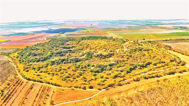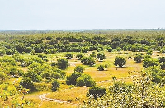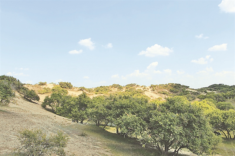 五马沙坨的地势宽广而平坦,略带起伏。沙坨的高度达到了170米,总面积达0.6平方公里。这里不仅是杜尔伯特蒙古族自治县内知名的自然景观区和中草药保护区,更是名扬海外的“小蒿子防风”主要产地。在这片土地上,野杏繁盛,从沙坨的顶端到坡谷,都生长着野杏树。每年的五月,杏花盛开,沙坨便化身为座座花丘、条条花谷。阳面花朵盛开繁茂,如云似雪;阴面花苞初绽,似火如霞。整个沙坨都弥漫着杏花的芬芳,吸引着无数的蜜蜂和蝴蝶前来采蜜。