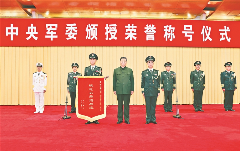7月9日,中央军委在京隆重举行荣誉称号颁授仪式。中共中央总书记、国家主席、中央军委主席习近平向获得“模范火箭炮兵连”荣誉称号的陆军某旅一营二连颁授奖旗,并同该连官兵代表合影留念。新华社记者 李刚摄