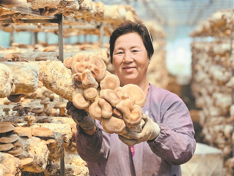 阳光透过棚室,温热的空气中弥漫着花菇特有的香气。一根根整齐摆放的菌棒上,淡褐色的花菇簇拥而生,“伞面”花纹爆开,焕发着勃勃生机。“一栋高标准大棚放置一万根菌棒,每年生长季可以采收六至七茬,一栋大棚至少收获2万斤花菇,按市场价7元一斤算,产值就是14万元。”负责花菇生产技术管理的赵景龙说起花菇种植的“钱景”,一脸笑意。
