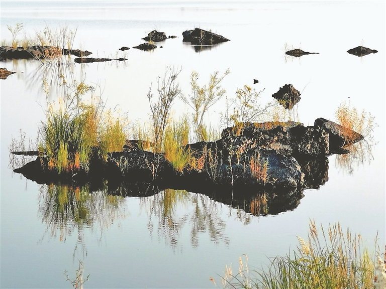 凌晨三点,我们准时来到五大连池观看日出的最佳地,东边的太阳正在缓缓跃出地平线,以平行的角度,将光线慢慢洒在这片土地上。如果说那无边的大平原还有些混沌,还有些朦胧,那眼前的五大连池,就是舞台中央最亮的地方。东边升起的太阳,就像舞台上的追光灯,追着五大连池的水、石、花、树,还有我们这些远道而来的看客,将他们勾勒、描摹、上色、定格。那静如处子的水面,完全是一面天空之镜,清晨的天空,如素面朝天的仙女,一身素衣,更显清纯优雅之气度。那湖中东一处西一处露出的火山石上面长着不同的花草树木,恰似一个个天造地设的盆景。在这些花草中,我认识了一种既像蒹葭又像蒲公英的花,叫做白头翁。它集中长在火山石上,乳白,轻盈,饱满,它的样儿像它的名字一样富有诗意。我曾偶尔听画师闲谈,说绘画就是色彩的搭配。五大连池的火山石和白头翁就是绝配,一黑一白,素年锦时。