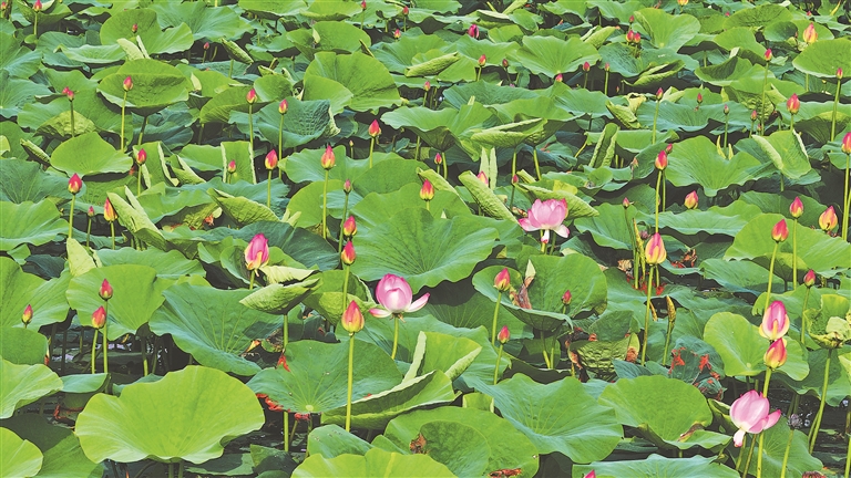 接天莲叶无穷碧,映日荷花别样红。盛夏时节,哈尔滨大剧院湿地里的荷花或含苞待放,或含羞盛开。粉色、白色的花瓣在荷叶间亭亭玉立随风摇摆。