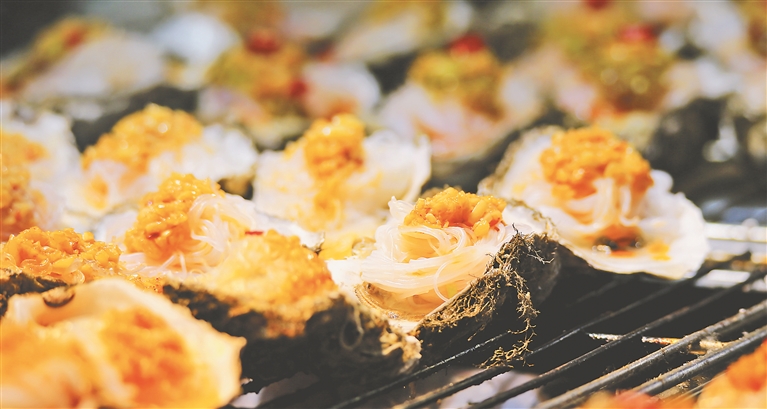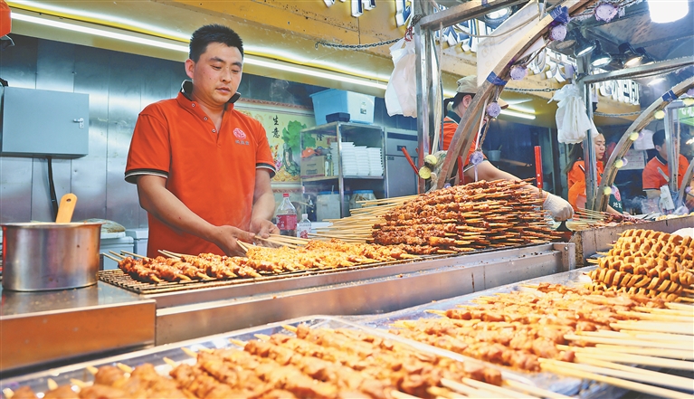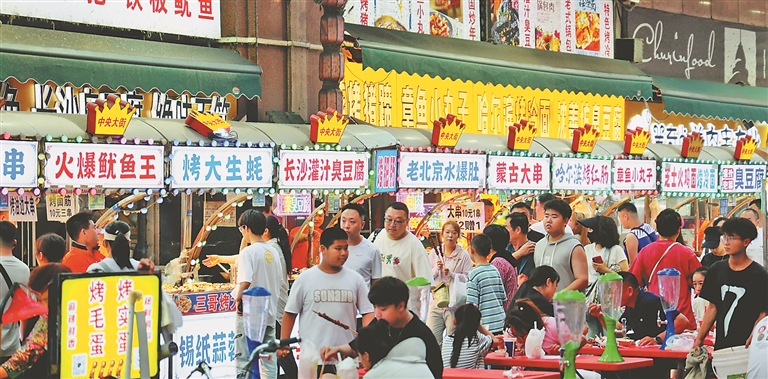 盛夏里,哈尔滨市中央大街的美食夜市灯火通明,人声鼎沸,各种食物琳琅满目,空气中弥漫着食物的香味。