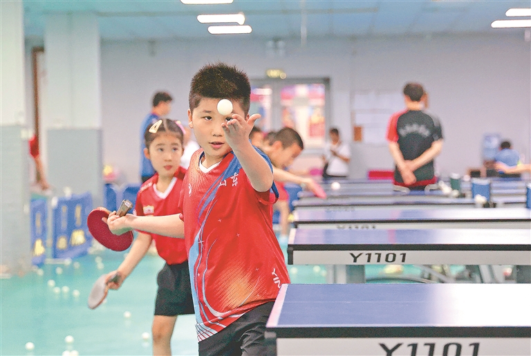 7月16日,小朋友在山东省临沂市兰山区一家乒乓球俱乐部学习打乒乓球。 暑期期间,各地的孩子们参加丰富的活动,乐享假日。新华社发