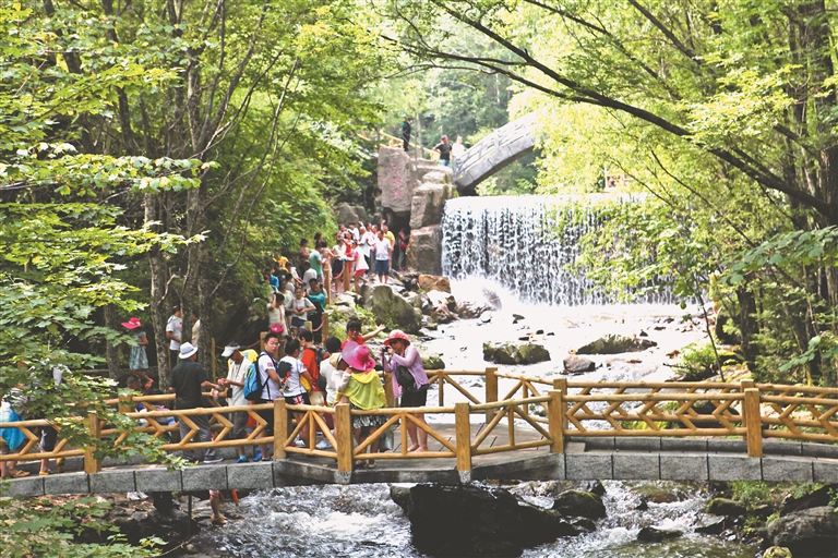 山峦起伏,森林茂密,溪流潺潺。时下,走进柴河局公司威虎山九寨景区,仿佛置身于一幅生动的山水画卷。沿着蜿蜒的林间栈道前行,游客们可以看到清澈见底的溪流在山间流淌,感叹情侣峰的鬼斧神工,体验穿越水帘洞的惊险刺激,感受九天瀑布的雄浑力量。玻璃栈道则是勇敢者的游戏,它高悬于半空之中,游客行走其上,仿佛漫步云端,四周是绝美风光,既惊险刺激又能将美景尽收眼底。