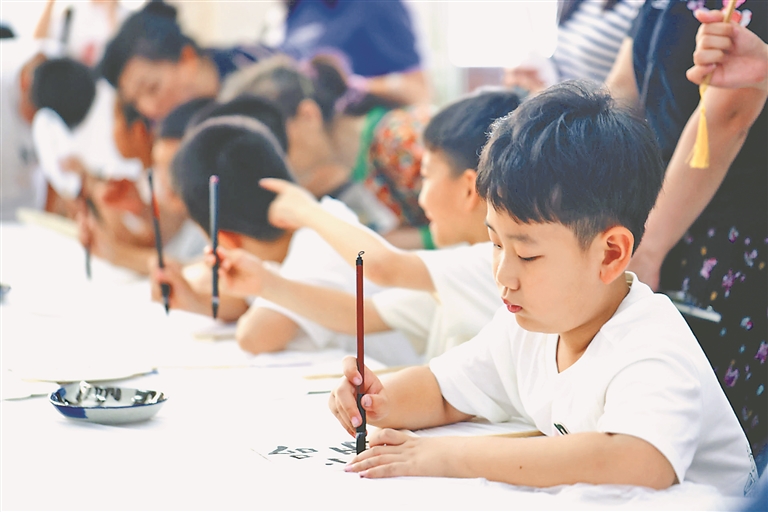 “老师手把手教我写‘哈尔滨’,看似简单的几个字,想在扇面上写漂亮还是有难度的。”韩佳昕小朋友说。