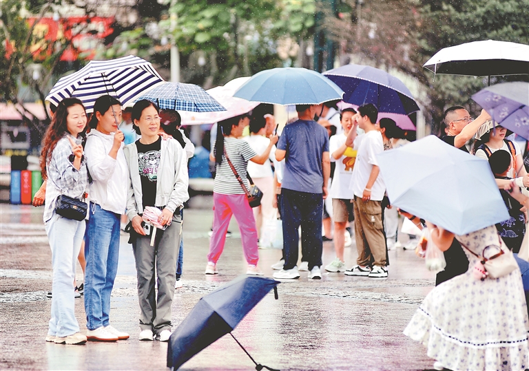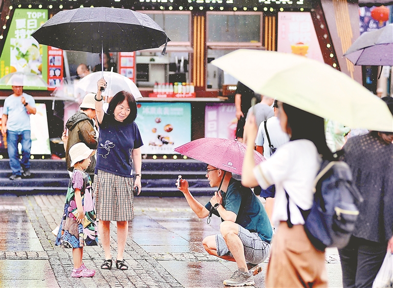 23日,哈尔滨市出现阵雨天气。在索菲亚教堂、中央大街、江畔等地,游客们一边观赏美丽风景,一边享受夏日清凉。