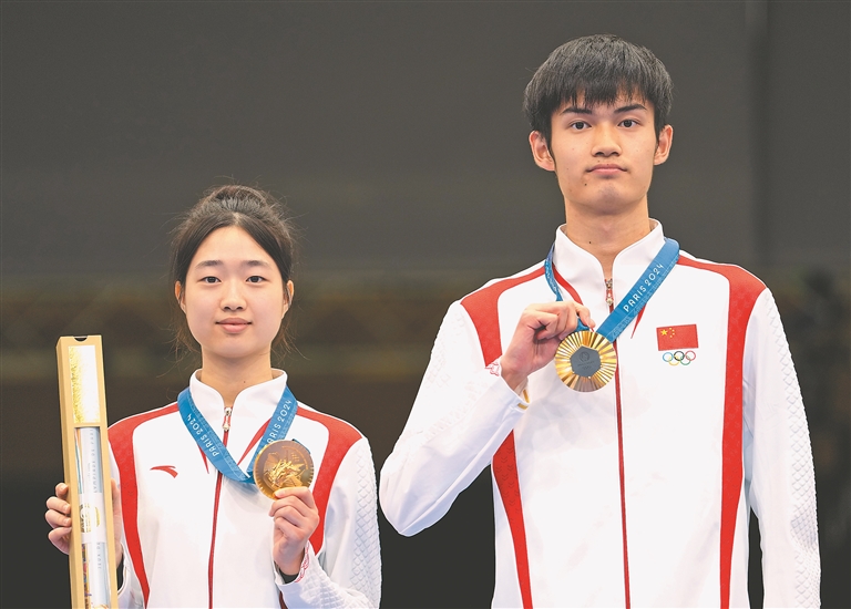 当日,在法国沙托鲁举行的巴黎奥运会射击10米气步枪混合团体决赛中,中国选手黄雨婷/盛李豪夺冠,赢得巴黎奥运会首枚金牌。