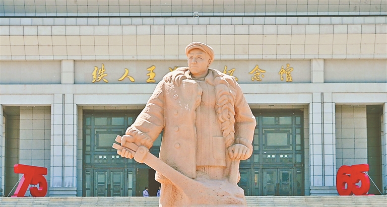 铁人王进喜纪念馆门前广场中央,花岗岩铁人雕像头戴前进帽,身披羊皮袄,手握刹把,目光刚毅,熙来攘往的参观人群从像下经过不时仰望,一如几十年来,铁人这个形象,丰碑一般巍然屹立在国人心中。