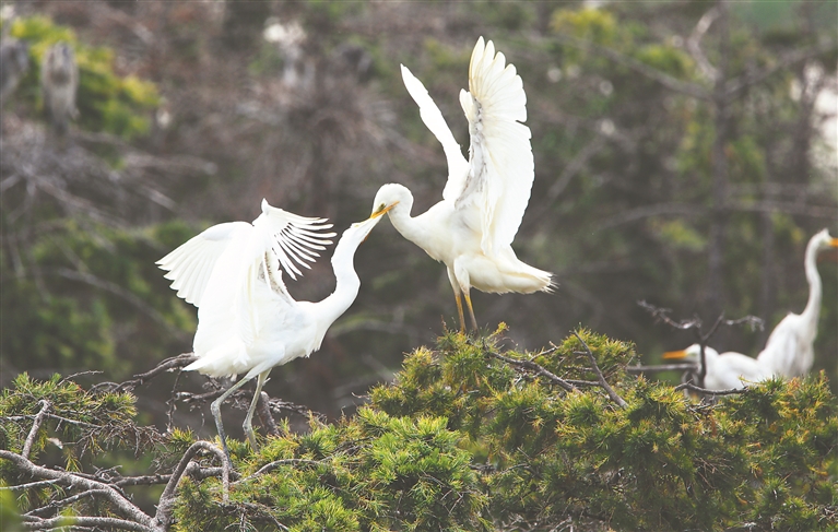 为保护岛上生态环境,游客禁止登岛,记者经允许随工作人员进入岛内拍摄。登高眺望,只见鹭鸟们或站立枝头,或展翅起舞,一幅和美的生态画卷跃入眼帘。树梢上摇摇晃晃的鸟巢里,苍鹭幼鸟有的伸着小嘴等待喂食,有的则扇动翅膀练习飞翔……数只成年的苍鹭安静地站在水边,直待猎物游过,便迅速出击;一群群因对自然环境要求非常高而被称为“生态鸟”的白鹭,飞姿曼妙地在水面上觅食、嬉戏、翱翔,它们羽毛洁白,身形苗条,步履优雅,翩然若仙。