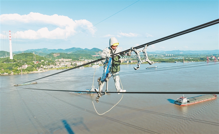 当日,为确保迎峰度夏期间电力供应可靠,安徽送变电工程有限公司的检修工人对500千伏肥繁5305线进行带电检修。该线路跨越长江,是安徽电网主要的过江通道,承担着安徽电网向华东地区送出电力的重要任务。