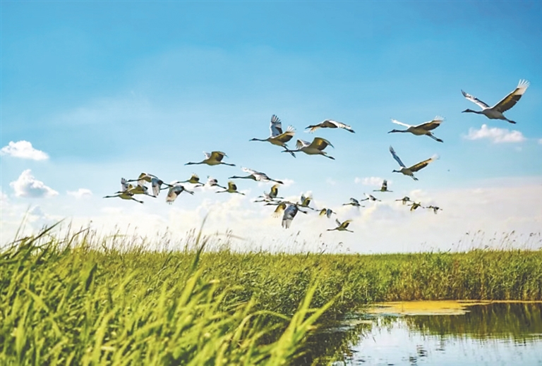 扎龙自然保护区芦苇沼泽广袤,水面辽阔,湖泊星罗棋布,苇草肥美,鱼虾丰盛,环境幽静,风光旖旎。辽阔浩瀚的水域在阳光的照射下,碧波荡漾、波光闪烁、粼粼耀眼,如同一片美丽的江南水乡泽国世界。