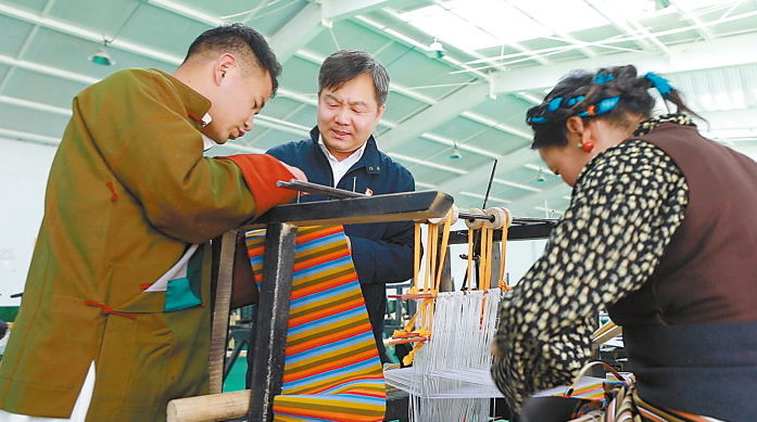 谢通门县珠峰牛羊示范合作社内工人正在编织氆氇。