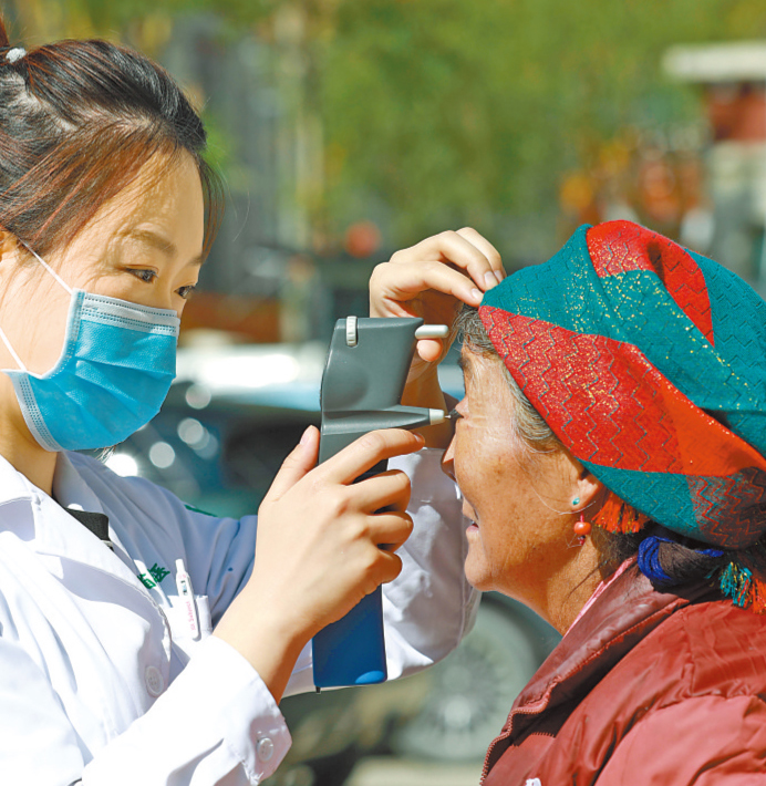 援藏工作队“雪域光明行”活动中,黑龙江援藏医生为群众检查眼睛。