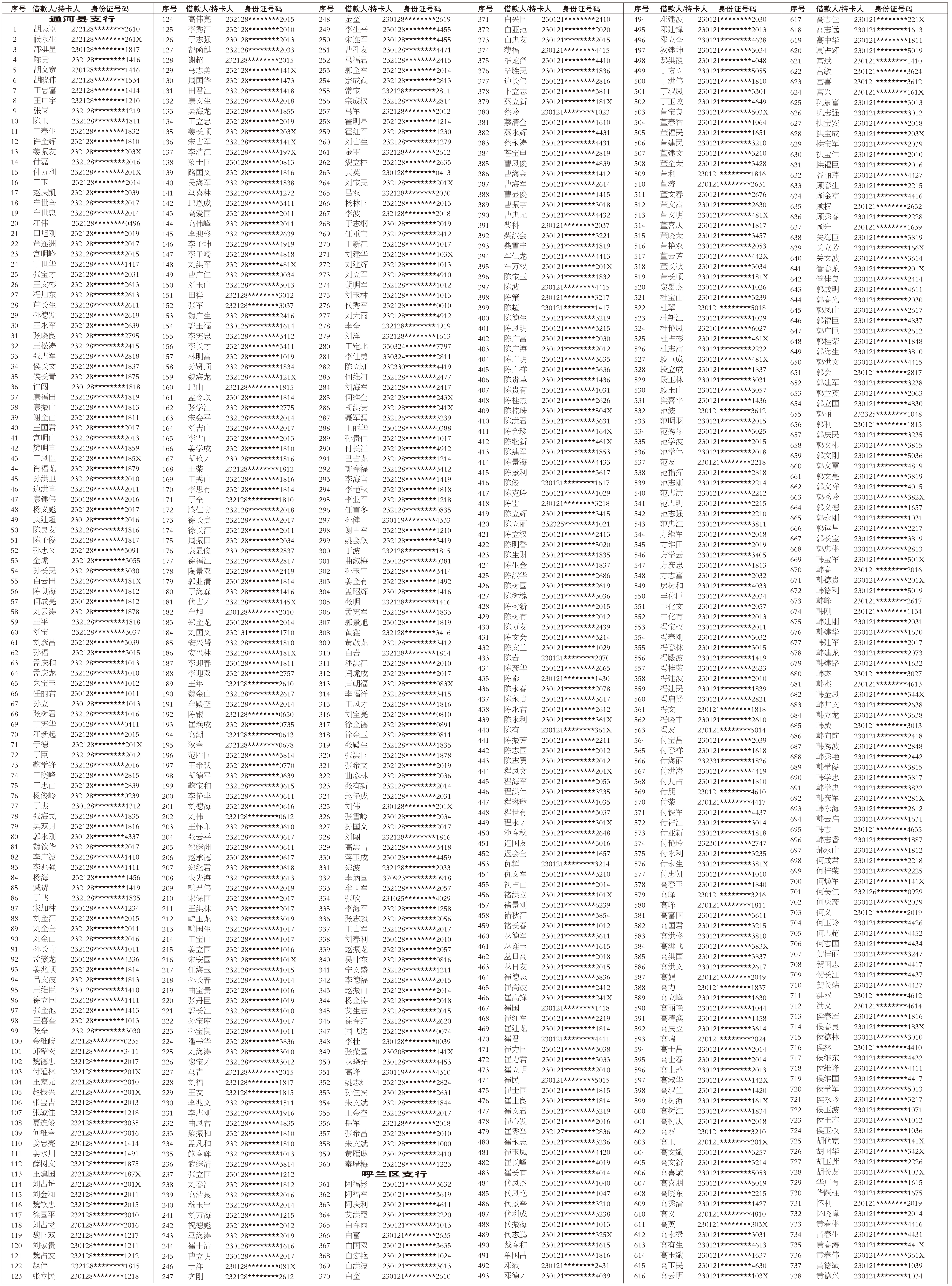 根据国家有关规定、司法解释和借款合同,对下列逾期债务予以公告催收,借款人立即履行偿还借款本息义务,特此公告。本公告将不定期更新。若您已依约履行了还款义务,请联系办贷机构,我行将及时删除相关公告信息。