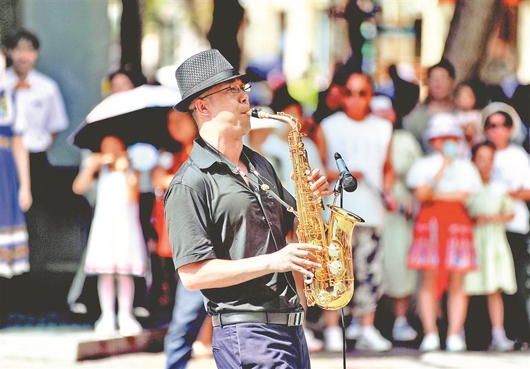 日前,哈尔滨市道里区中央大街与红专街交口处,多位艺术家现场为人们表演,吸引许多游客围观。琵琶、萨克斯、手风琴等乐器演奏的经典乐曲,博得人们阵阵掌声。美妙的旋律回荡在街道上空,为百年老街增添了更多的艺术魅力。