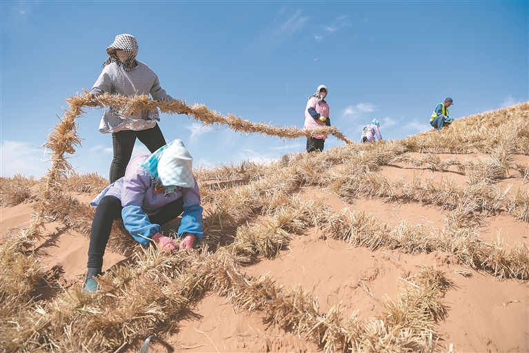 图②:治沙工人在宁夏中卫市境内的腾格里沙漠铺设刷状网绳式草方格沙障。